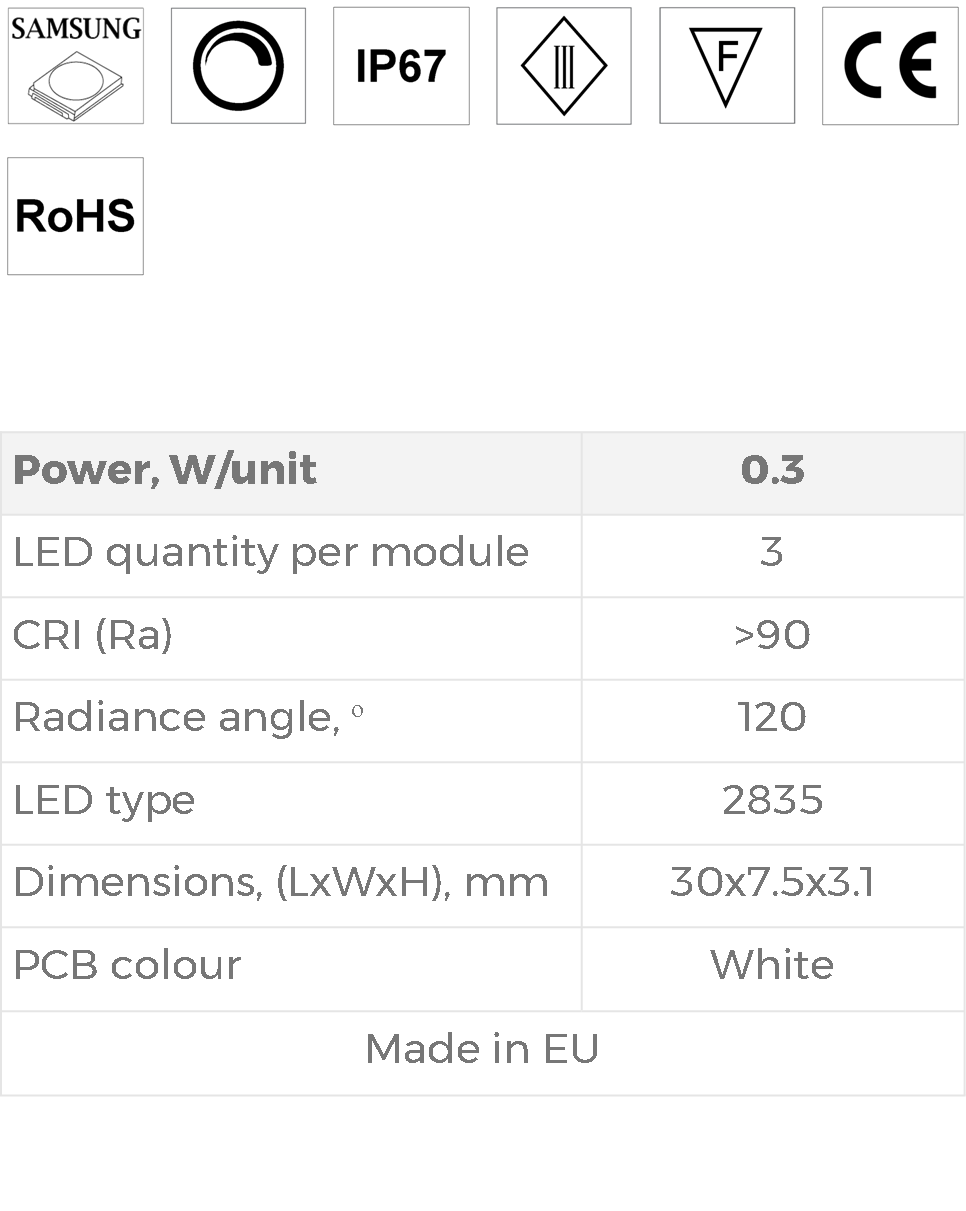Compact 0.3W LED modules, designed for uniform lighting of advertising light boxes and interior accent lighting up to 15 cm depth.