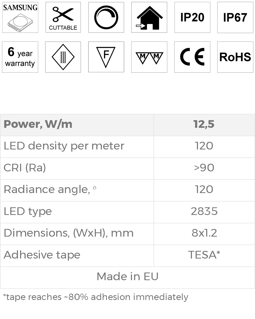 Meets standards: LST EN 60598-1:2015+AC:2016+A1:2018 (9.2.7cl.,9.2.8cl.), EN 60068-2-14:2009 (IEC 60068-2-14:2009), EN 62031:2008+A1:2013+A2:2015.