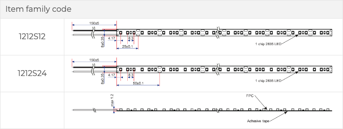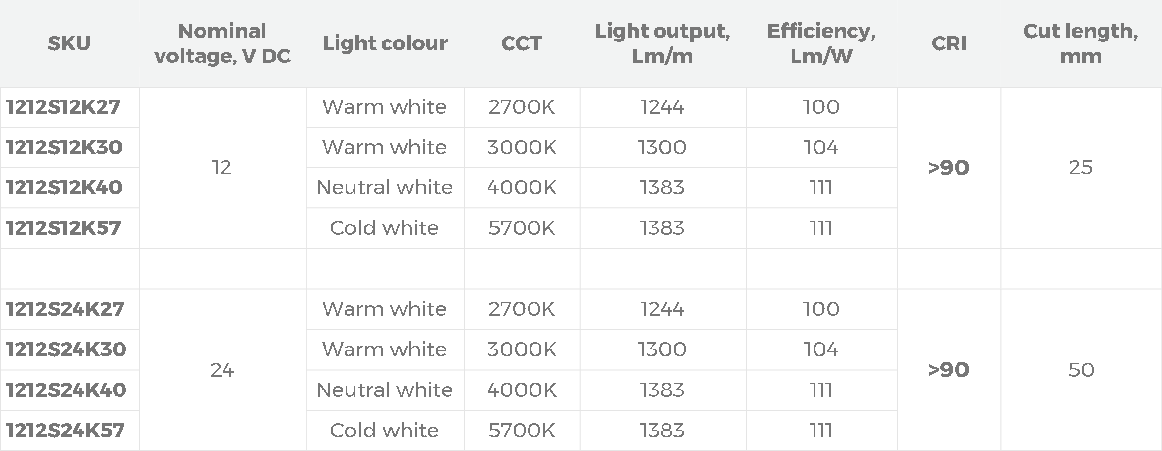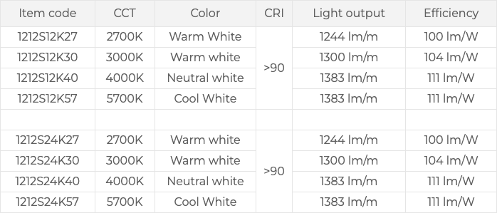 Item codeCCTColorCRILight outputEfficiency1212S12K272700KWarm White>901244 lm/m100 lm/W1212S12K303000KWarm white>901300 lm/m104 lm/W1212S12K404000KNeutral white>901383 lm/m111 lm/W1212S12K575700KCool White>901383 lm/m111 lm/W1212S24K272700KWarm white>901244 lm/m100 lm/W1212S24K303000KWarm white>901300 lm/m104 lm/W1212S24K404000KNeutral white>901383 lm/m111 lm/W1212S24K575700KCool White>901383 lm/m111 lm/W