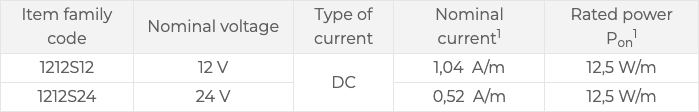 Item family codeNominal voltageType of currentNominal current1Rated power Pon11212S1212 VDC1.04 A/m12.5 W/m1212S2424 VDC0.52 A/m12.5 W/m