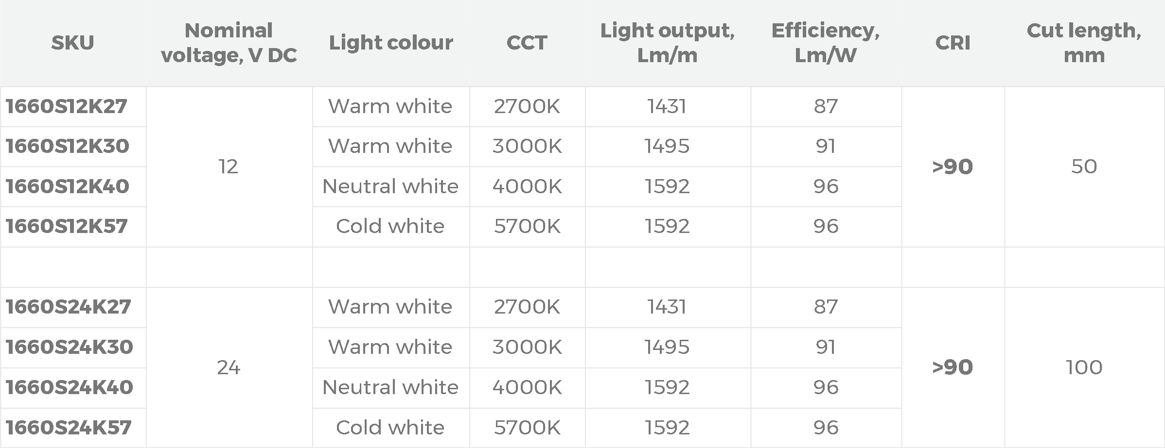 Item codeCCTColor descriptionCRIUseful luminous flux Φuse2Efficiency21660S12K272700KWarm white>901431 lm/m87 lm/W1660S12K303000KWarm white>901495 lm/m91 lm/W1660S12K404000KNeutral white>901592 lm/m96 lm/W1660S12K575700KCool White>901592 lm/m96 lm/W1660S24K272700KWarm white>901431 lm/m87 lm/W1660S24K303000KWarm white>901495 lm/m91 lm/W1660S24K404000KNeutral white>901592 lm/m96 lm/W1660S24K575700KCool White>901592 lm/m96 lm/W