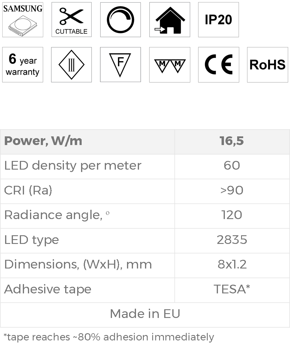 Meets standards: LST EN 60598-1:2015+AC:2016+A1:2018 (9.2.7cl.,9.2.8cl.), EN 60068-2-14:2009 (IEC 60068-2-14:2009), EN 62031:2008+A1:2013+A2:2015.