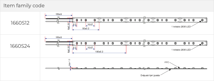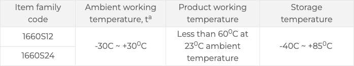 Item family codeNominal voltageType of currentNominal current1Rated power Pon11660S1212 VDC1.38 A/m16.5 W/m1660S2424 VDC0.69 A/m16.5 W/m