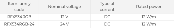 Item family codeNominal voltageType of currentRated powerRFX534RGB12 VDC12 W/mRFX534RGB-2424 VDC12 W/m