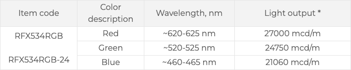 Item codeColorWavelengthLight intensity*RFX534RGB / RFX534RGB-24Red~620-625 nm27000 mcd/mGreen~520-525 nm24750 mcd/mBlue~460-465 nm21060 mcd/m