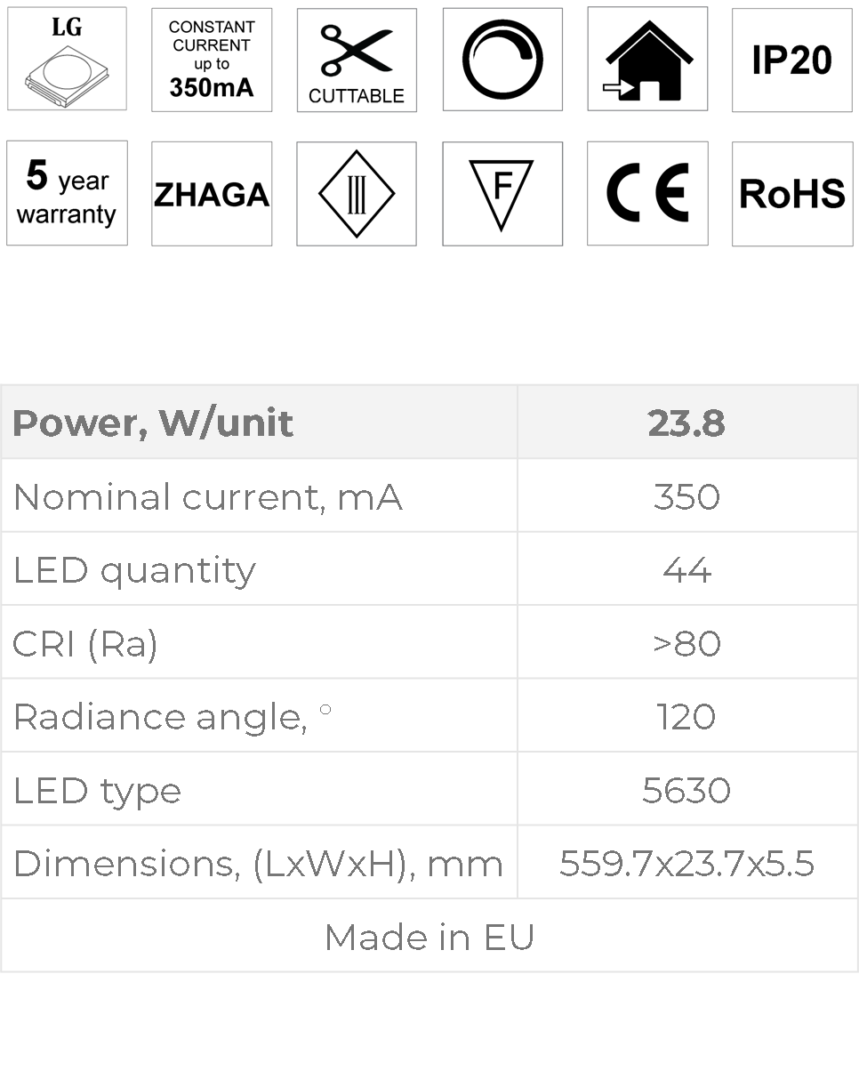 RL56 – high efficiency linear LED module with LG Innotek LEDs, cuttable every 25 mm, achieving up to 195 lm/W efficiency, designed for professional luminaire manufacturing.
