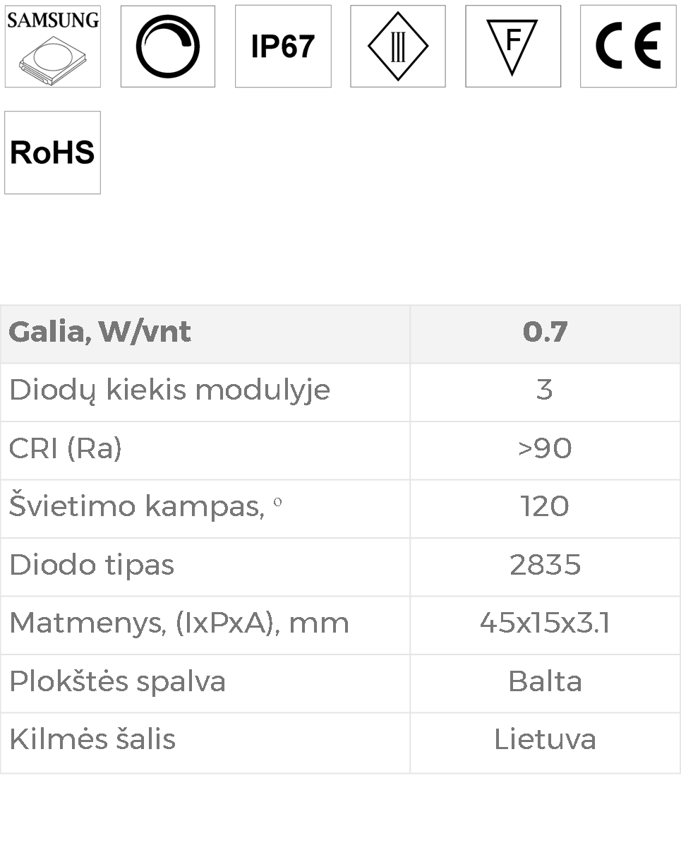 - Maži, 0,7 W galios LED moduliukai, skirti reklaminėms šviesdėžėms ir interjero apšvietimui