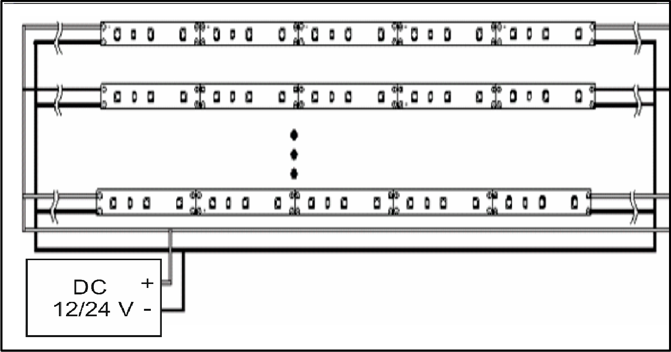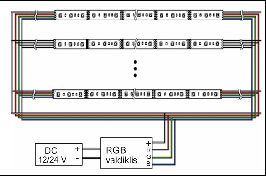 galią. Maitinimo šaltinis turi būti ~30% galingesnis, nei bendra LED juostelių galia.
